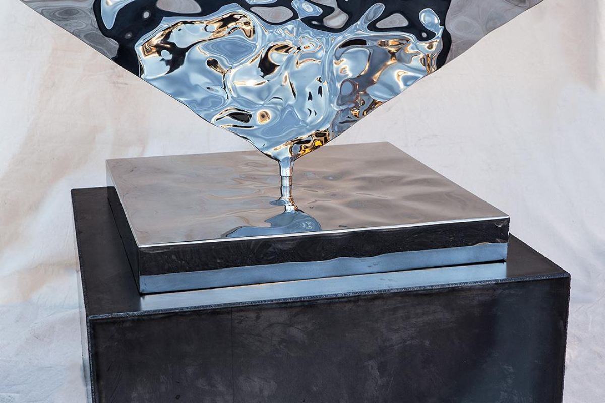 Display with at least 1.8 m of free clearance so the diagonal can breathe and the cantilever reads cleanly. Light from two opposing 3000–4000 K sources at low grazing angles to articulate the ripple without burning the highlight on the vertex; add a soft overhead fill to keep the shadow under the point luminous. Use neutral surroundings; polished floors double the levitation effect. Clean only with microfiber and a pH-neutral solution; never use abrasives on the polished faces.