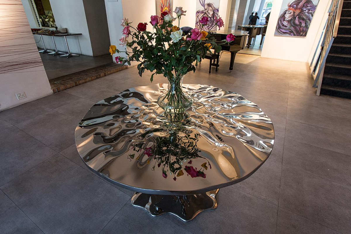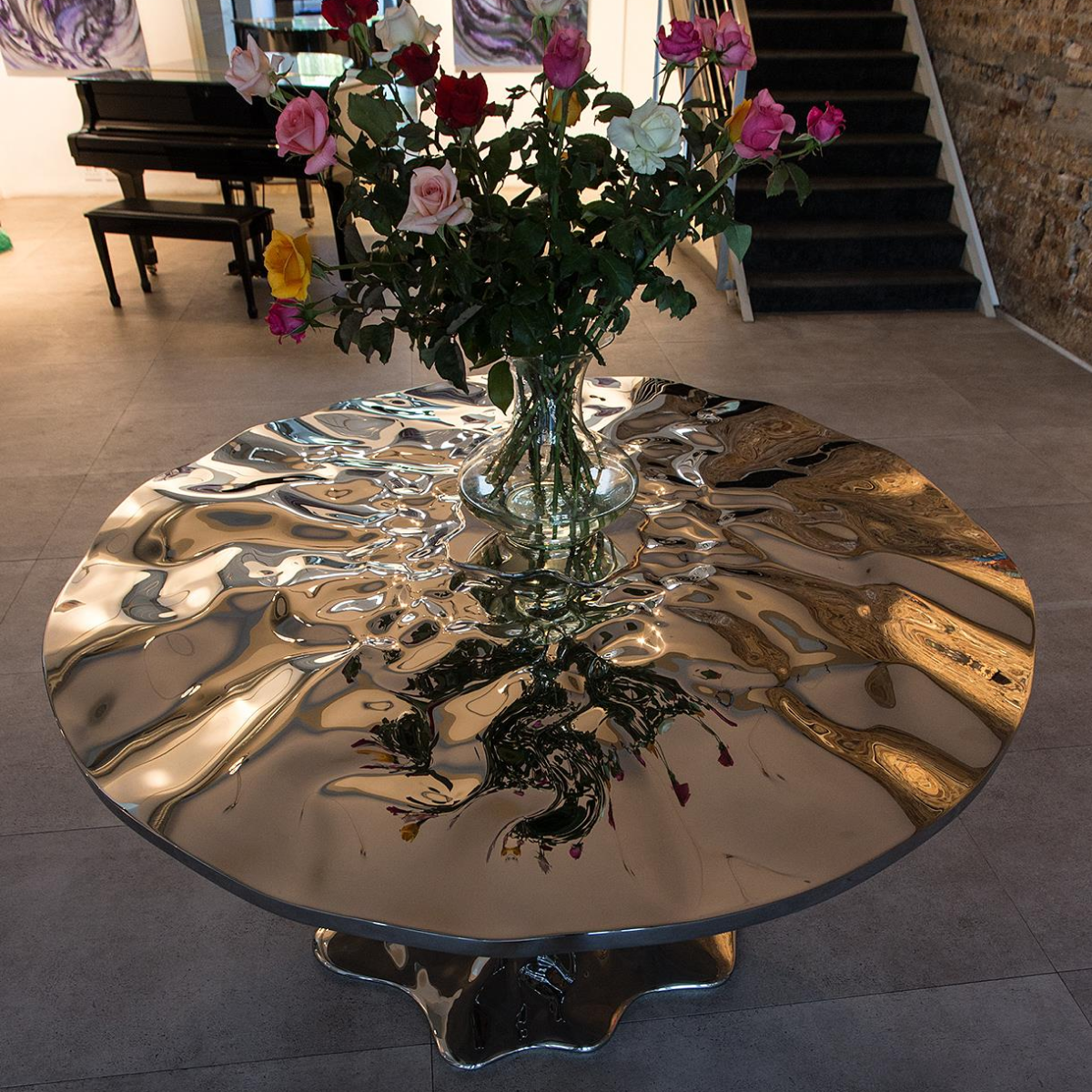 Mirror-polished 316L stainless steel; diameter 1.5 m; height 80 cm; sculptural table suitable for galleries, lobbies and private collections.