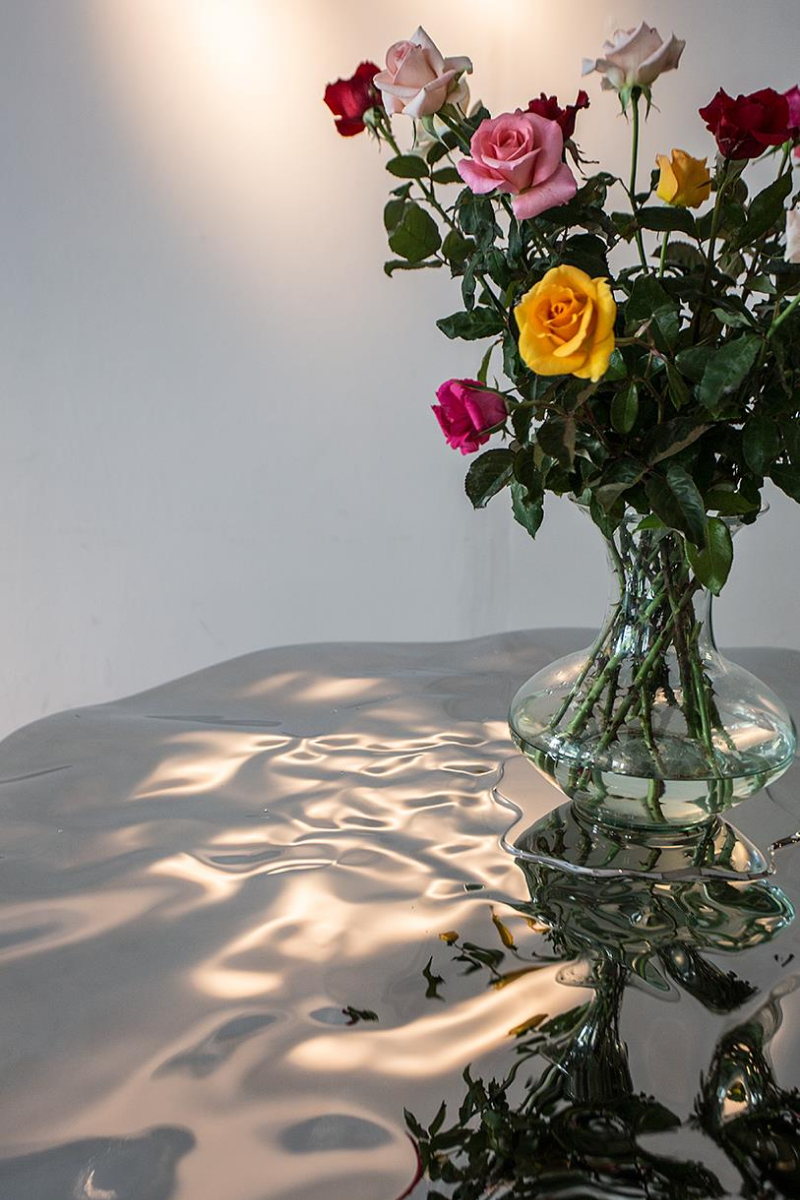Bloom turns function into apparition. The tabletop behaves like a water surface caught at the instant of expansion—rings push outward, folding the room into shifting cells of light. A tapering stem carries this motion down into a “puddle” foot that appears to flow around the floor plane. The piece treats stainless steel as a living skin: reflective, responsive, and animated by anything placed upon it.
