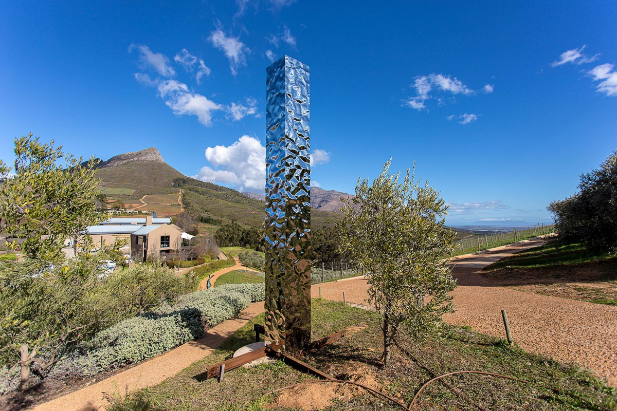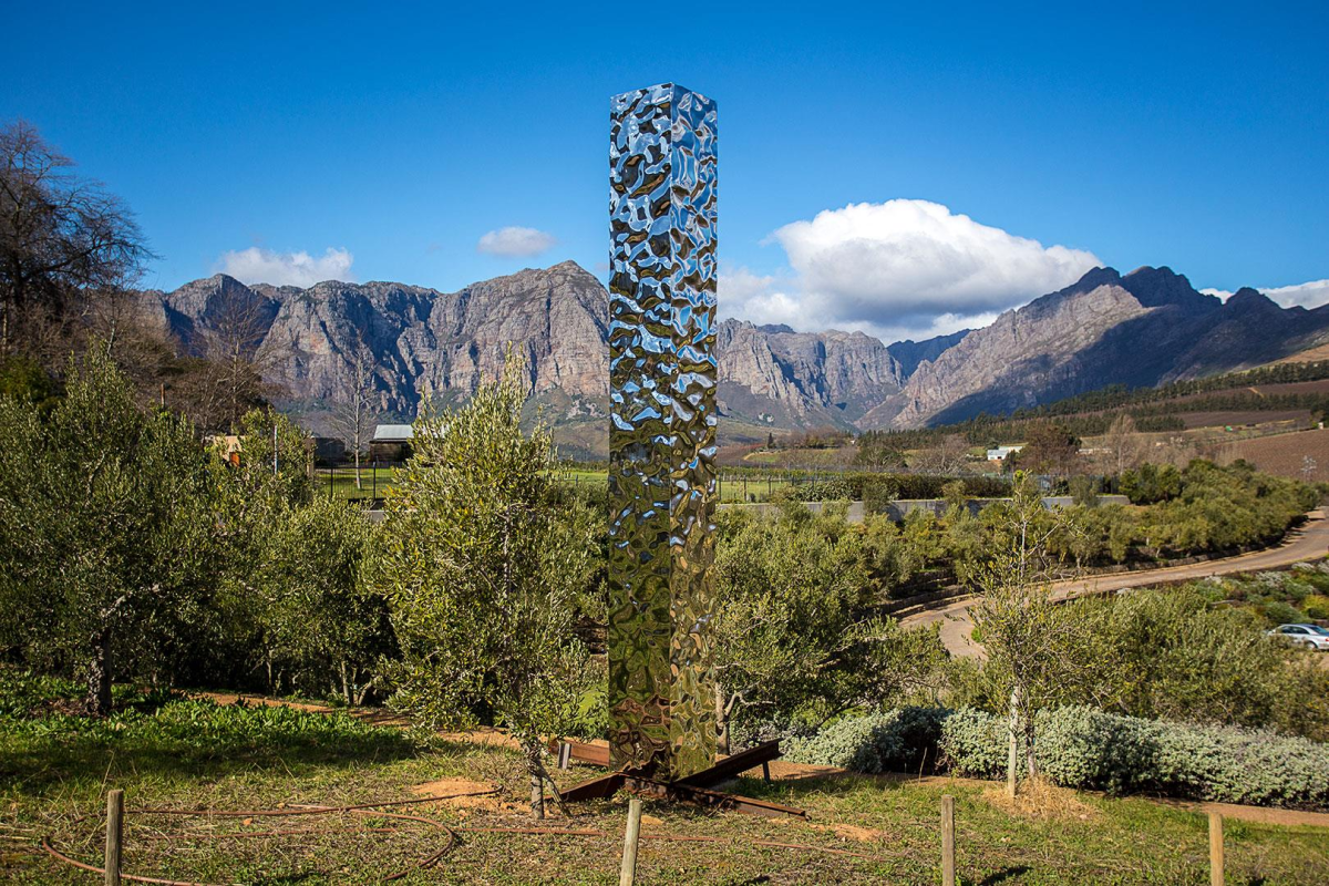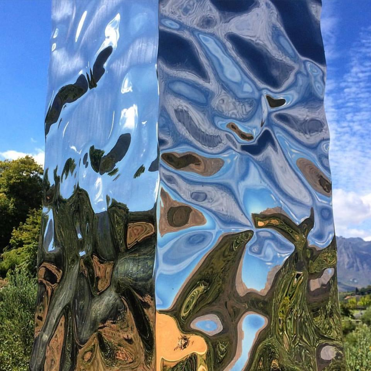 Column is a beam of reflection. The height compresses the horizon into stratified bands that shimmy up the shaft, so mountains, clouds and trees migrate and mix as you move. The form is classical—a straight, square monolith—yet its mirrored relief rejects stillness. It behaves like water standing upright, a lens that stitches ground to sky and folds the viewer into the scene.