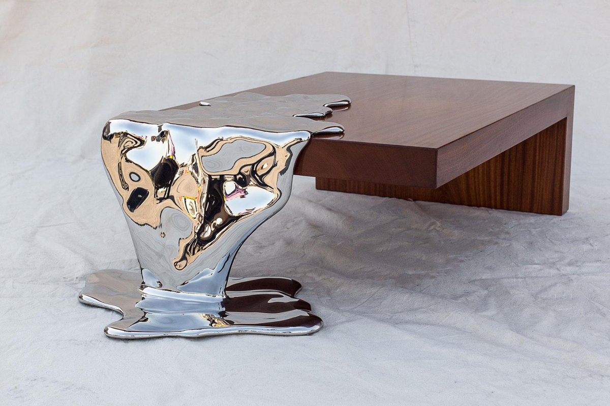 Fluid Foundations stages a meeting of states: timber as earth, steel as water. The hand-finished Bubinga plane is calm and rectilinear; from its edge, a silver current seems to overflow, pooling on the floor and then rising to carry the weight. The reflective metal reads the room as moving image, while the wood anchors it with grain and warmth. Together they propose a foundation built from flow—strength found in what looks soft.