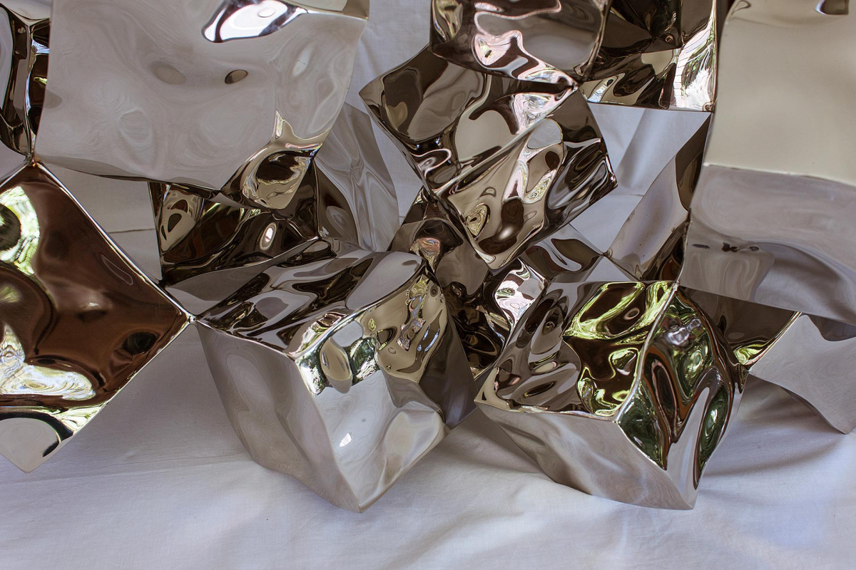 Each cube is a unit of order; the composition is pure instability. By denting, twisting and stacking the modules, the piece turns geometry into drama. The Mercury Effect skins every facet with a moving world—trees, sky and viewers slide across the planes, doubling the sense of motion even though the sculpture stands still. From one side it seems to collapse; from another it climbs. Free Fall frames the instant between cause and consequence, holding turbulence in polished calm.