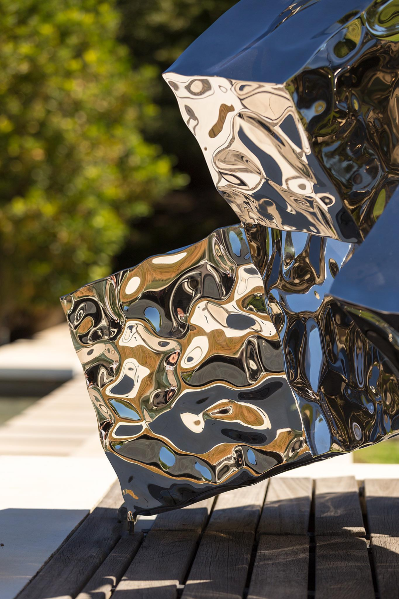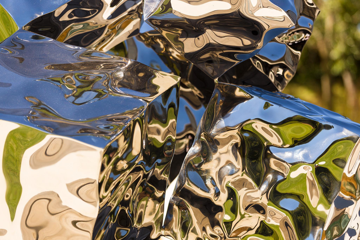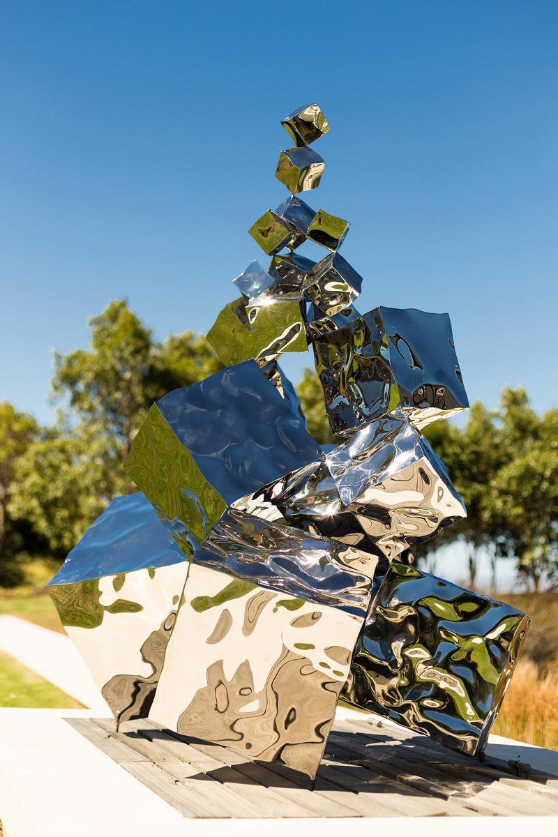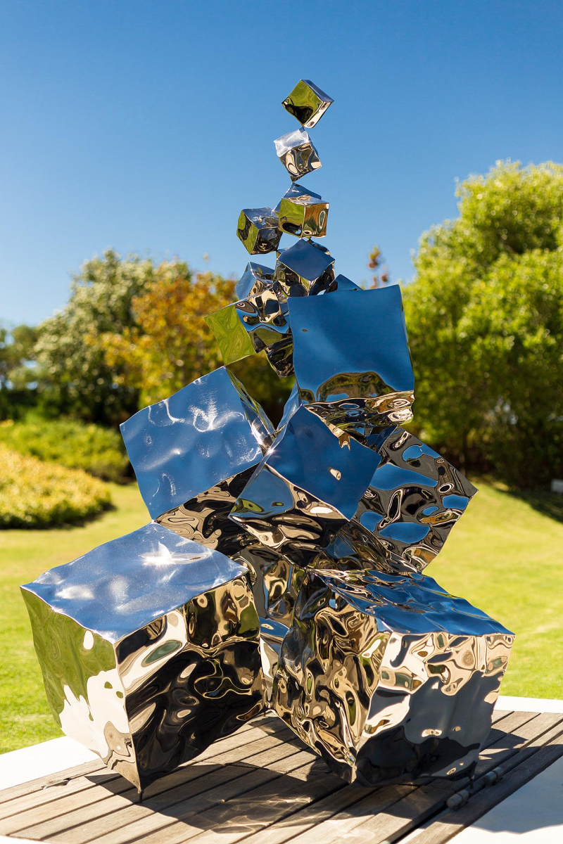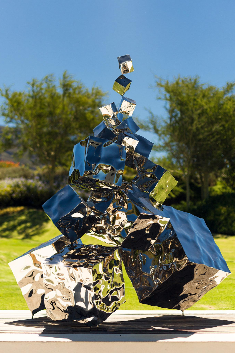 With Free Fall III, Rado Kirov turns the cube into momentum. Each block is slightly rotated and offset, so the stack reads like a captured trajectory—mass translated into rhythm. The mirror-polished faces behave like liquid: trees, sky and viewers shear across the planes, while deep shadows carve between volumes to keep the silhouette crisp. The ascent culminates in a small, seemingly weightless cube that hangs above the cluster, converting gravity into poise. The work extends Kirov’s Mercury Effect research, where sculpted steel acts as both object and lens, letting the environment paint itself onto the sculpture.