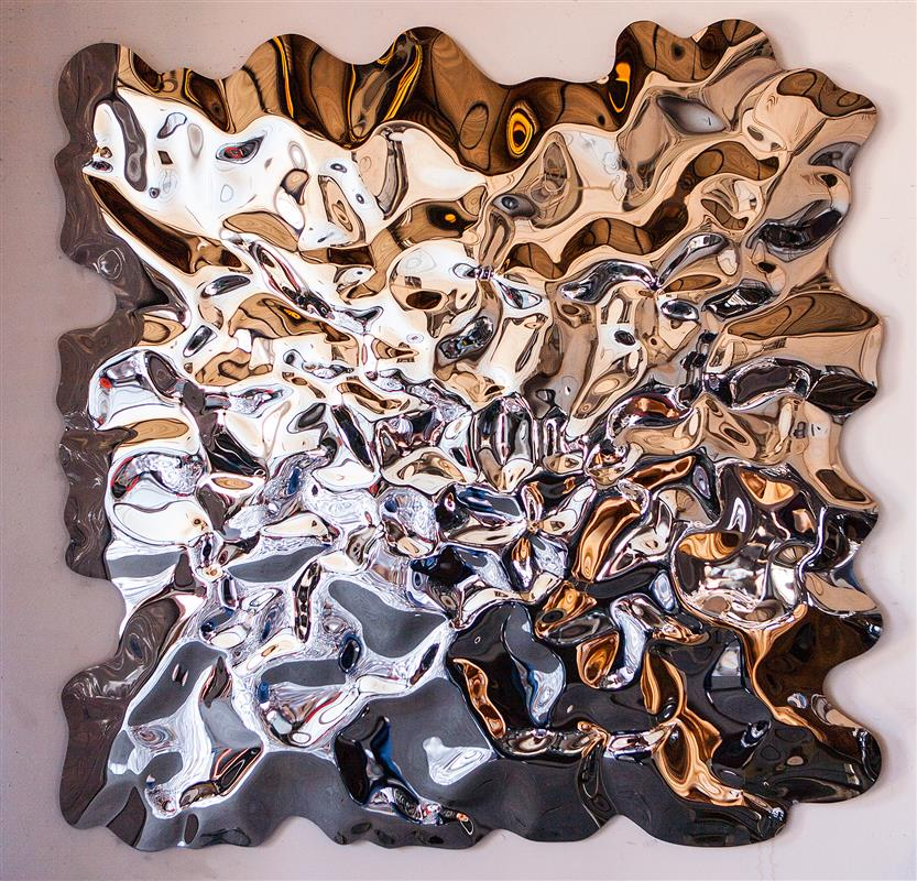Liquid Mercury explores the boundary between sculpture and surface, transforming polished steel into a living, reactive skin. The work behaves like a metal pool caught mid-motion—ripples freeze into sharp, glasslike forms, while reflections cascade and fragment across its surface. By embracing distortion, the piece challenges the viewer’s perception of solidity and depth, turning space, light, and movement into active participants in the sculpture’s expression.