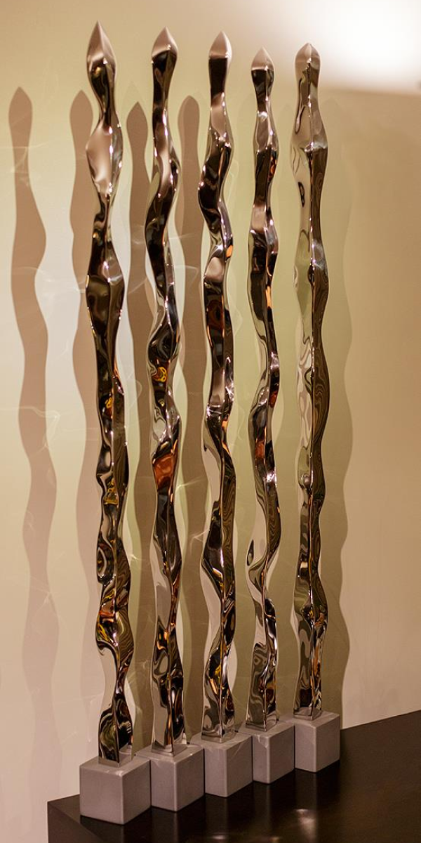 The Liquid Rods series translates the Mercury Effect into pure line. Every rod is forged and worked by hand until a calm sinus of waves runs its length. Seen together, the elements read like parallel currents; walk around them and the reflections shear, braid and unbraid, throwing highlights across the room. The work is architectural in spirit—strictly vertical yet optically fluid—so that surrounding space, colour and movement are pulled into the steel and returned as a slow, luminous shimmer.