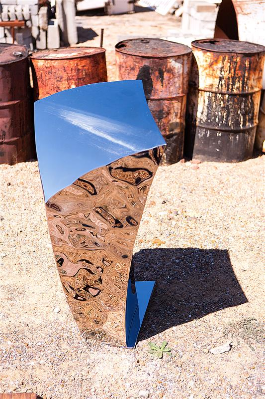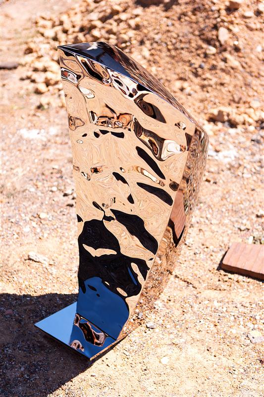 Position as a freestanding piece with at least 1 m of circulation space. Soft, diffused lighting (3000–4000 K) highlights the reflective distortions without producing harsh glare. Works well in galleries, performance settings, lobbies and environments where the podium’s reflective skin can interact with the surrounding space and audience movement.