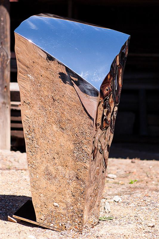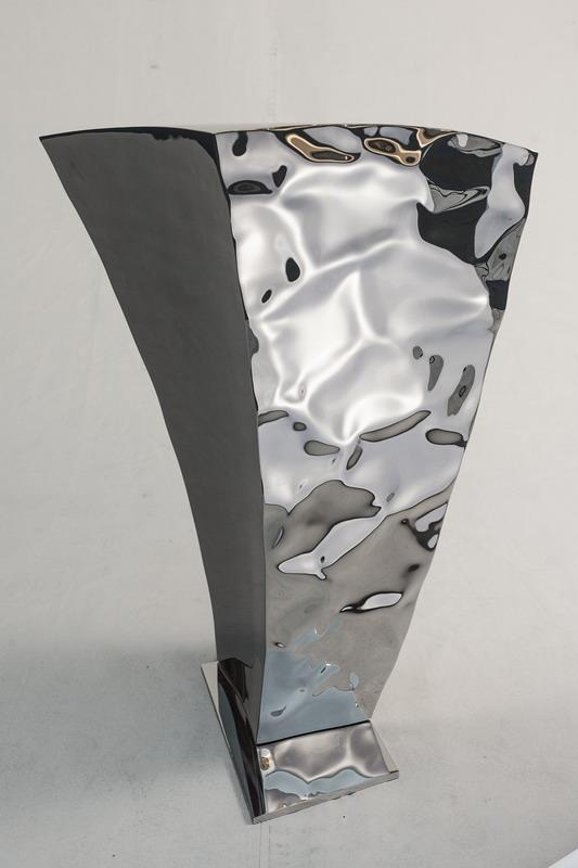 Pedestal II — rectilinear stainless-steel pedestal with fluid distortions