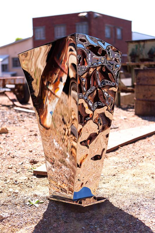 The work invites close inspection and slow movement around it, letting the viewer experience how a familiar object can become an environment of flowing reflections.