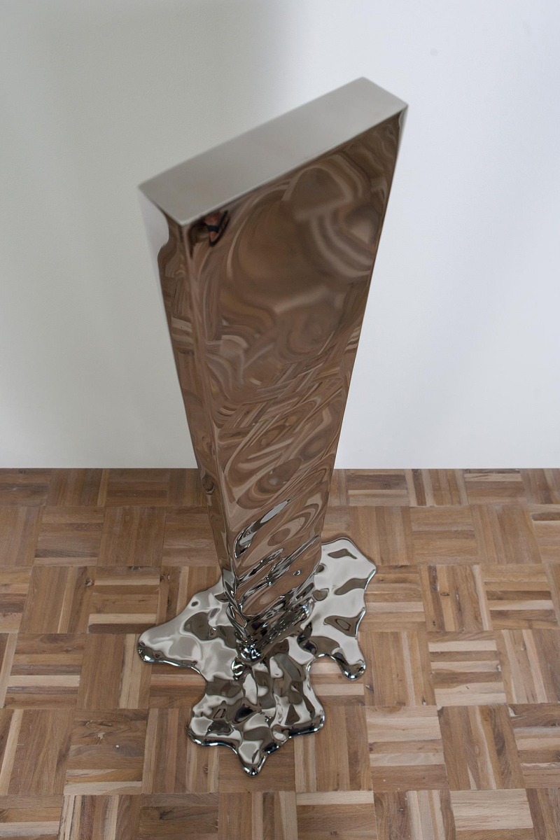 “Melting Slab” compresses a phase change into a single object. The vertical retains its architectural clarity while the surface behaves like ripples stopped mid-flow. At the base, gravity appears to liquefy the metal into a reflective puddle, turning a hard material into a memory of water. The work is a study in tension—between column and spill, permanence and flux, weight and light.