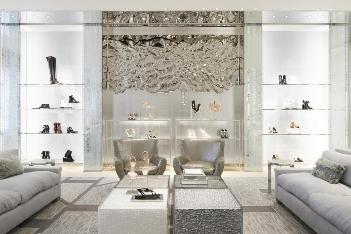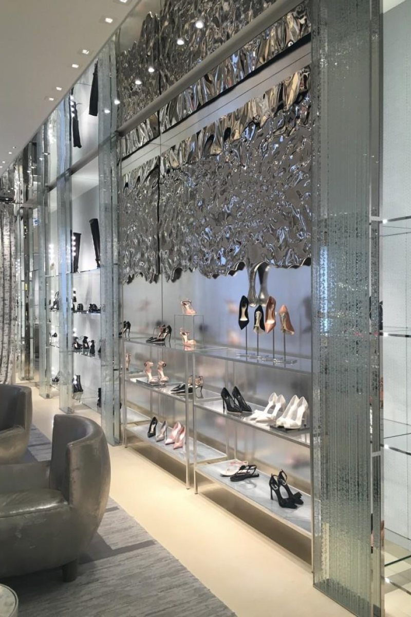 Mercury Landscape is a large wall-mounted relief that turns reflection into a living river. Hand-formed, mirror-polished stainless steel breaks light into currents, eddies and ripples; the boutique’s architecture, people and product become the image that flows across the surface. At the lower edge a single “drop” gathers, as if the metal itself were liquid and about to fall—an accent that anchors the composition and hints at tides and rainfall. Installed within Peter Marino’s luminous interior for Dior, the work behaves like a luminous skin: calm from a distance, intensely animated up close. It does not depict a landscape; it performs one—mapping the movement of visitors and the changing day into a shifting cartography of chrome and sky.