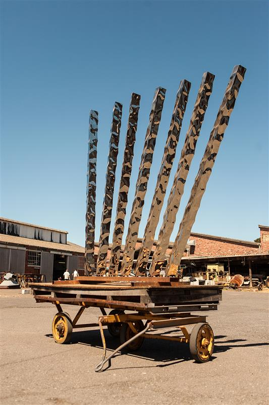 Mohawk is well suited for open outdoor environments, courtyards, sculpture gardens, or industrial architectural settings. The mirrored surface interacts strongly with sky, landscape, and human presence, making the piece highly site-responsive. For installation, the sculpture should be positioned where it can receive natural light, allowing the tall reflective columns to create elongated shadows and shimmering highlights throughout the day.