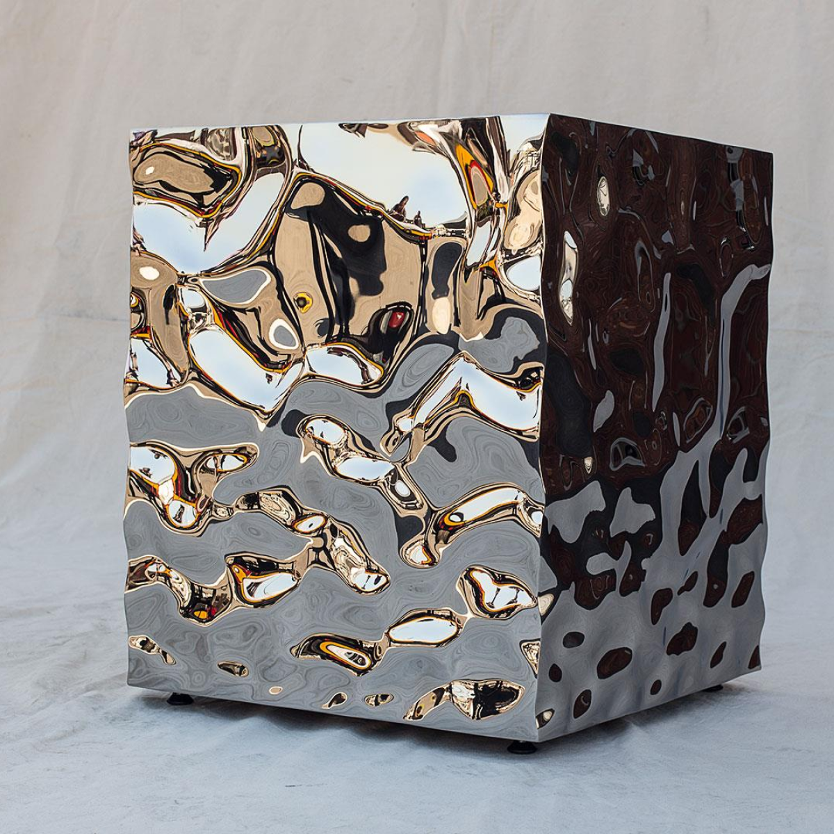 Pangastal treats the cube as a pressure vessel for reflection. The steel sides behave like a tense skin—dented, swelling and eddying—so the room fragments into moving currents across the faces. The dense, open-pored Panga Panga lid lands as a calm plane, a ground for objects and a counterpoint to the mercurial skin. The piece makes a simple volume feel alive: static geometry animated by light and touch.