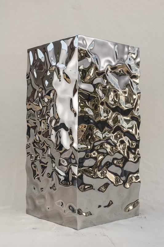 Used as a base, Pedestal II visually integrates the displayed work into its reflective skin, creating a single, unified sculptural ensemble rather than a separate object and support.