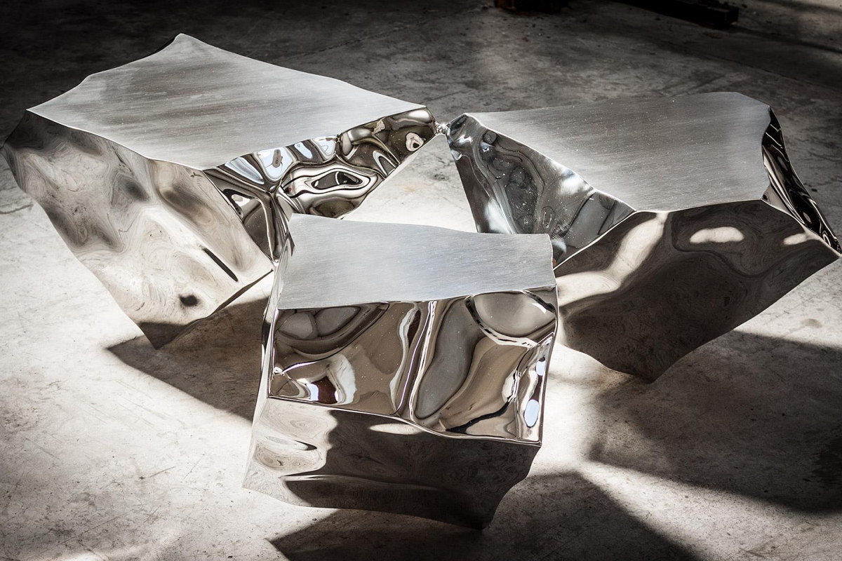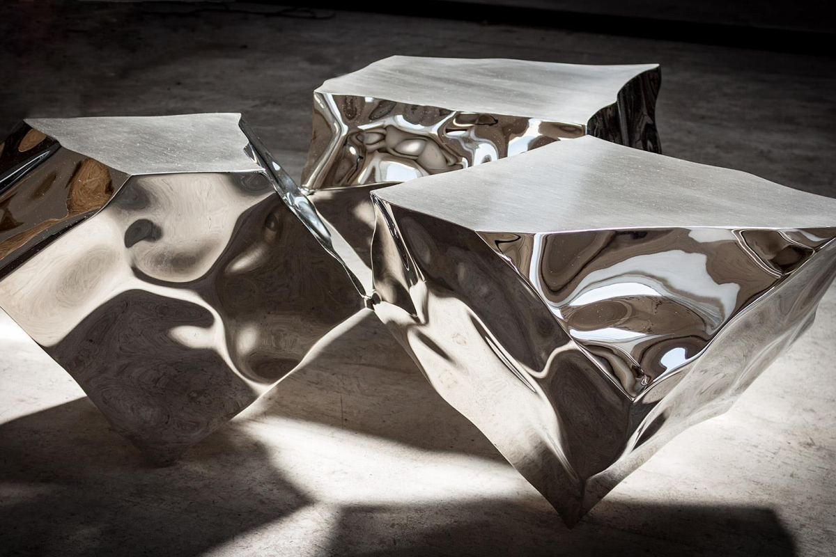 Material: mirror-polished 316L stainless steel (Mercury Effect). Configuration: three related volumes derived from cross sections of a cube; coffee-table height. Year: 2018. Display: gallery and private interiors.