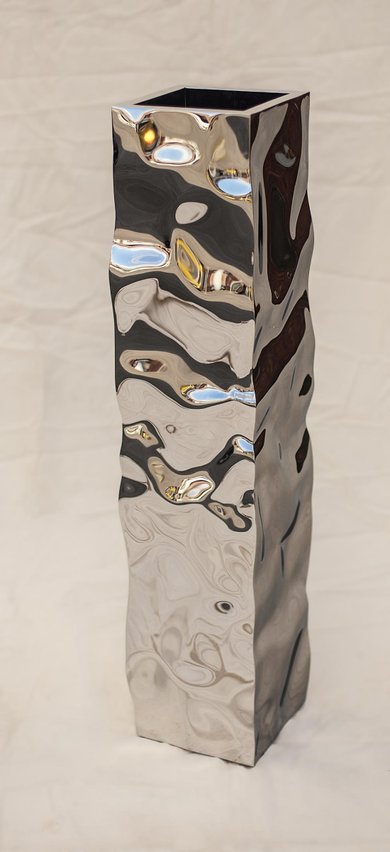 Mirror-polished stainless steel, columnar planter sculpture; suitable for interior lobbies, galleries, and private collections. (Plant optional/curatorial.)