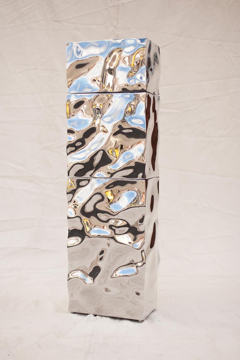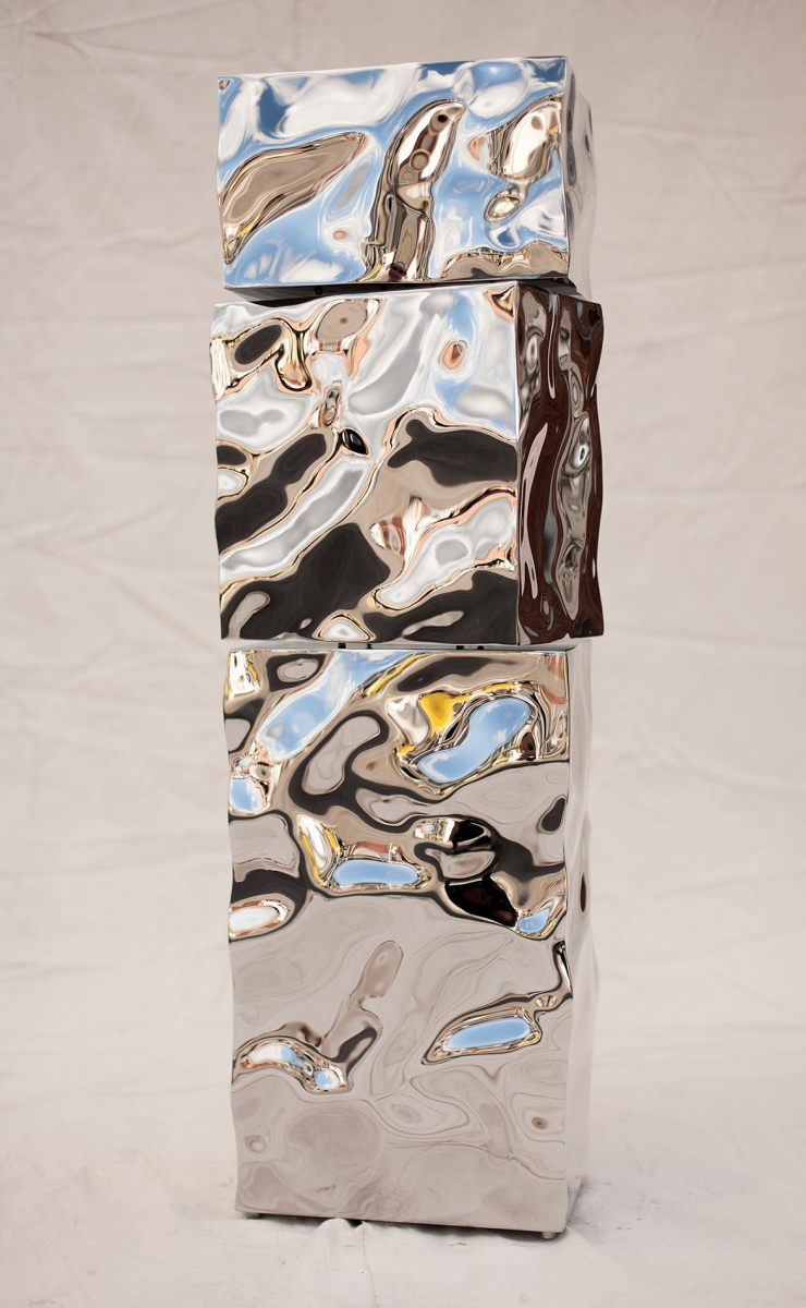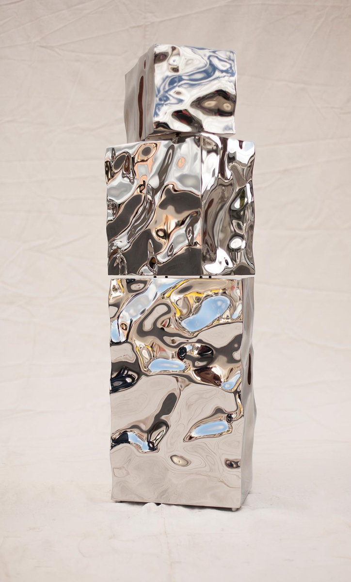 Mirror-polished 316L stainless steel; three deformed, cube-like modules stacked as a single column; human-scale vertical format. Suitable for indoor display; outdoor installation possible with appropriate anchoring and maintenance. Finish is mirror-grade with hand-worked distortion patterns.