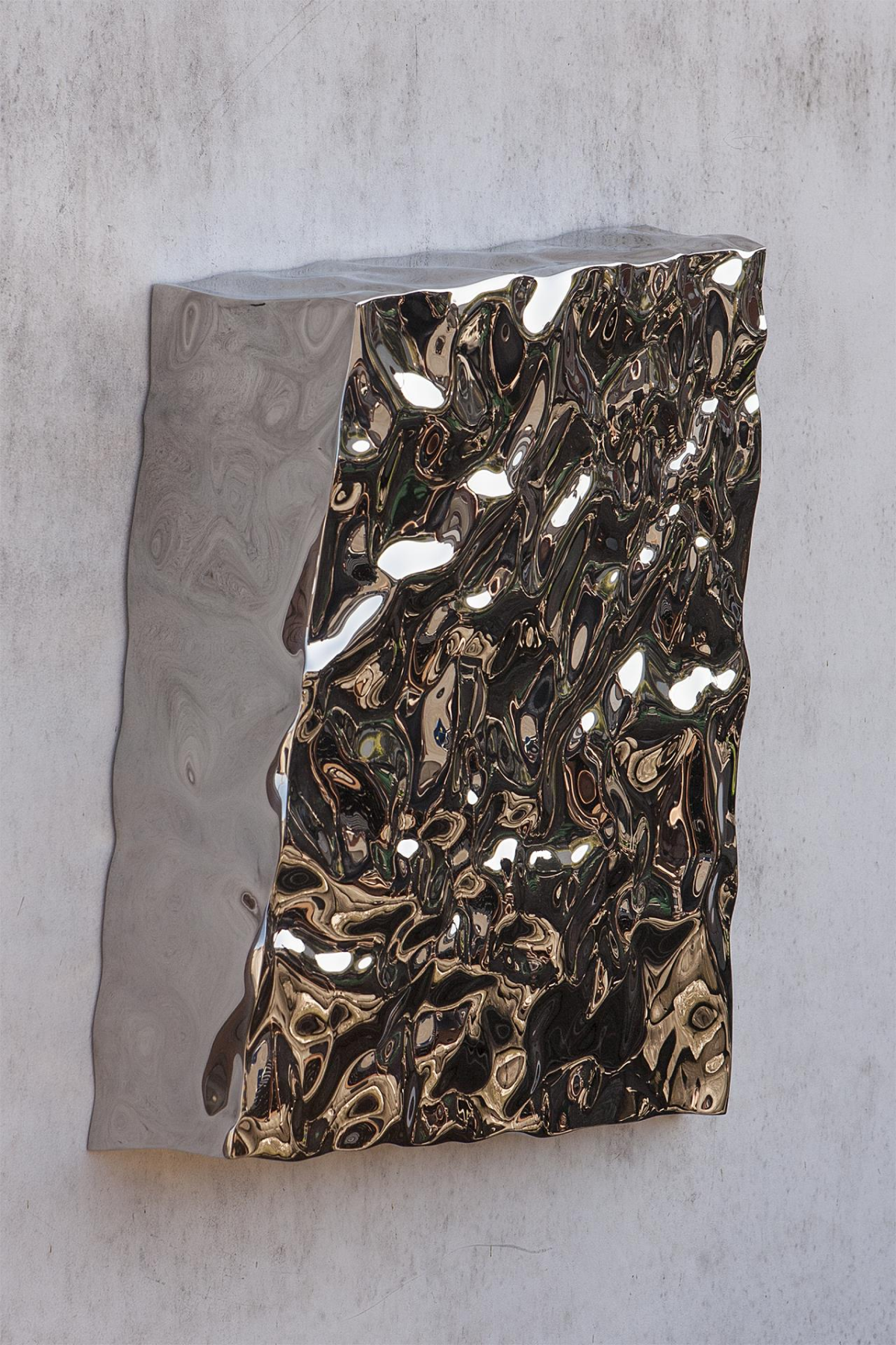 Wall Sculpture examines how a solid plane can behave like a moving substance. Formed from mirror-polished stainless steel, the work begins as a flat sheet and is then subjected to controlled distortions that ripple across the surface like waves frozen in time. The resulting relief becomes a topography of liquid geometry—peaks, troughs, and tension lines that fracture the surrounding environment into hundreds of shimmering fragments.