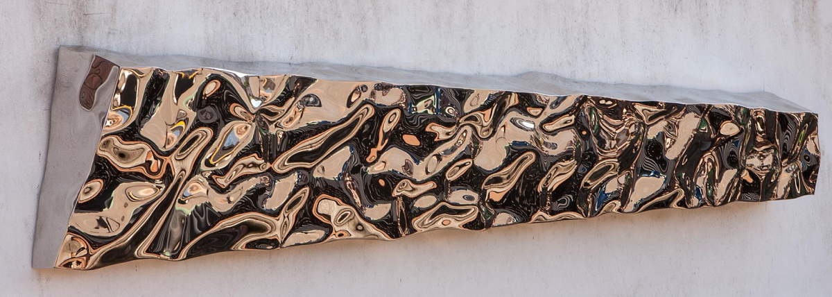 This work treats the wall as a horizon where metal behaves like water. The long, ribbon-like form carries a dense micro-topography—eddies, vortices, and wavelets—that fragment architecture and viewers into shifting mosaics. The bronze cast of the reflections warms the piece, so it reads neither as chrome nor as patina, but as light thickened into matter. Installed at eye level, it invites slow viewing: step closer and the field becomes abstract; step back and the band reads as a continuous current running through the room.