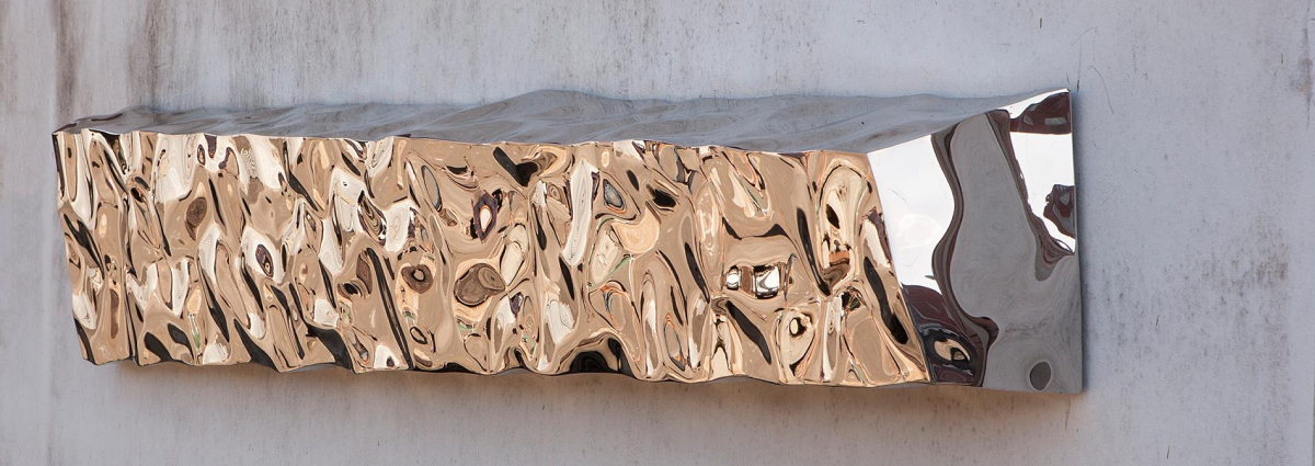 Mirror-polished stainless steel with warm-tone finish; wall-mounted horizontal relief; concealed hardware; dimensions by commission / on request.